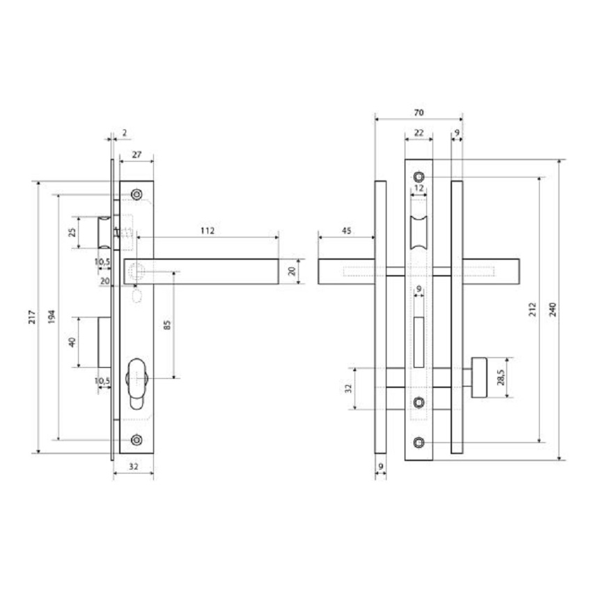 Замок врезной с ручками. Предназначен для установки в калиточные двери, правого и левого открывания.Возможна установка в деревянные двери, а так же двери из алюминиевого профиля. Дверь может быть закрыта на защелку и открыта с помощью фалевой ручки при открытом засове замка. Универсальная защелка. Корпус и торцевая планка из нержавеющей стали. Межосевое расстояние 85мм. Удаление ключевого отверстия 20мм. Ручки с полимерным покрытием по каталогу RAL. Материал - сталь. Механизм секрета с перфоключом, длина 70 мм, 5 ключей. Материал - цинковый сплав.