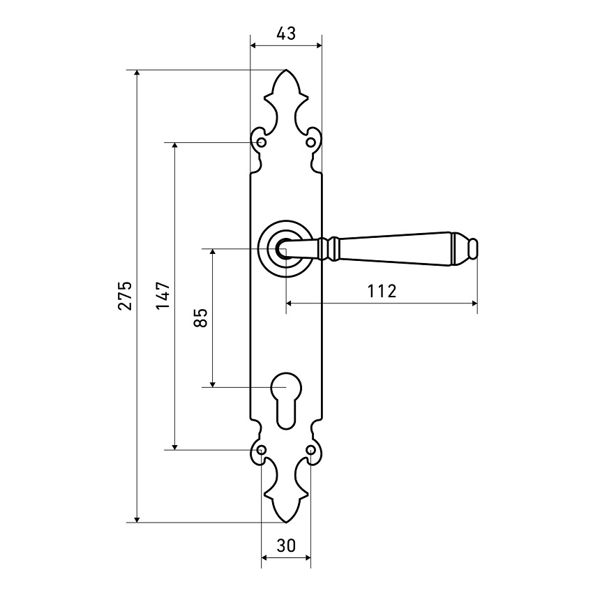 Ручка на планке под замок и цилиндровый механизм. Материал - алюминиевый сплав, сталь. Межосевое расстояние - 85 мм, размеры планки - 43 х 275 мм, длина ручки - 135 мм. В комплект входят винтовые стяжки и квадратный штырь (8х8 мм) 105 мм. Для дверей, толщиной 35-45 мм.